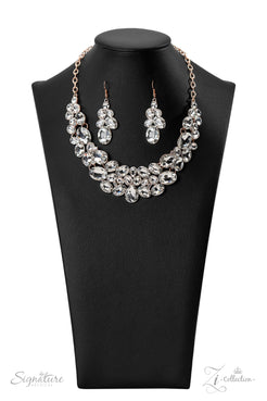 Oversized white rhinestones with exaggerated faceted surfaces gather into glittery clusters along the collar. A teardrop-shaped gem sits front-and-center, inviting the eye to explore the scattered shapes throughout the design. Refined sparkle radiates from every angle, as the rose gold finish of the chain and fittings emit a cozy glow. Features an adjustable clasp closure.