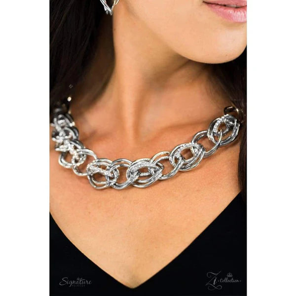 Featuring a subtle hammered finish, doubled chain-links join below the collar in a fierce fashion. Encrusted in glittery white rhinestones, circular frames alternate along the hoops, adding a blinding shimmer to the bold industrial palette. Features an adjustable clasp closure.