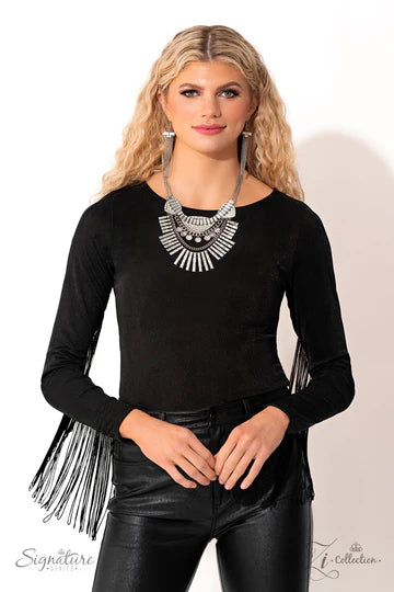 Oversized chain links, silver discs hammered in texture, and a blinding display of brilliant white rhinestones combine to create an iconic statement piece. At the top of the elaborate display, three spade-like pendants filled with countless white rhinestones emerge behind a bowing row of glassy, emerald-cut gems; giving way to subsequent layers of grit and glitz. A thick silver chain drapes below the emerald-cut gems above, allowing textured discs dotted with a subtle shimmer to take their moment in the spotlight. A classic silver chain falls into place below the texturized discs, offering a timeless reprieve, as bars formed from stacks of emerald-cut gems and topped by pairs of classic white rhinestones fan out along the collar in a striking finish. Features an adjustable clasp closure.