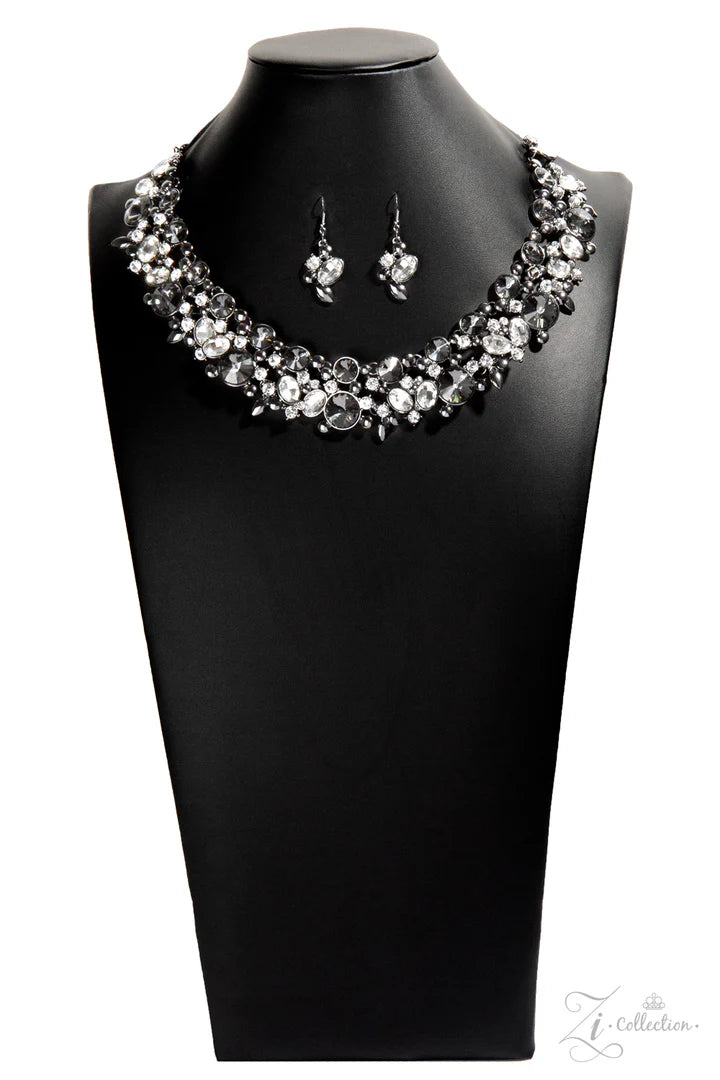 Encased in shimmery metallic frames, clusters of glassy white rhinestones and mysterious smoky gems in a range of sizes and shapes wrap dramatically around the collar in a show-stopping finish. Sleek gunmetal accents are sprinkled among the sparkling rhinestones, adding just enough edge to the stunning display. Features an adjustable clasp closure.