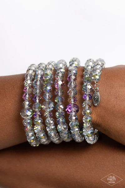 Countless clear, crystal beads connect to a netted backdrop of interlocking silver links, building into a boisterous display of glassy elegance. Each faceted edge of the beads is brushed in a dreamy, reflective, colorful finish, resulting in an effervescent masterpiece that flickers and flashes at every turn. Features an adjustable clasp closure. Due to its prismatic palette, color may vary.