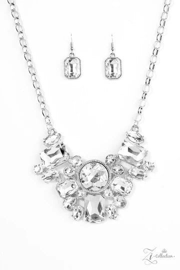 Featuring an array of round, marquise, teardrop, and elegant emerald style cuts, glittery white gems fan below the collar. Encased in sleek silver frames, the dramatic gems catch and reflect the light, casting blinding shimmer from every angle. Features an adjustable clasp closure.