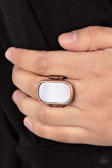 An oversized rectangular white pearlescent shell is encased in an antiqued copper frame resulting in a refreshingly tranquil centerpiece atop the finger. Features a stretchy band for a flexible fit.