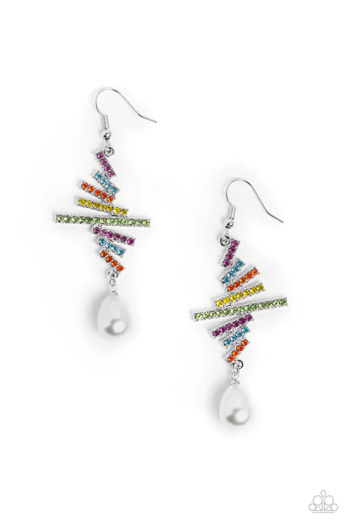 Encrusted with dainty pink, blue, yellow, orange, and green rhinestones, silver horizontal bars of varying sizes stack down the ear in a whimsical array. Dangling at the bottom of the staggered display, an elongated white pearl shines for a touch of refinement at the ear. Earring attaches to a standard fishhook fitting.