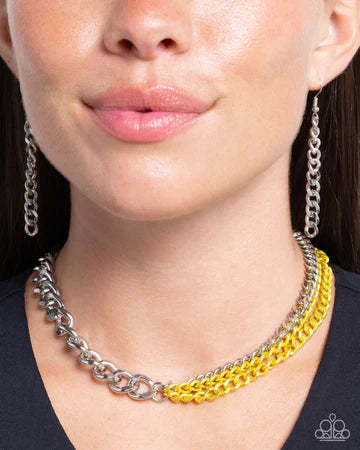 A colorful collection of yellow-painted silver curb chains and a solitaire silver curb chain boldly pair with a gritty, oversized silver curb chain around the collar, interlocking through a silver jump ring at the center of the design, resulting in an intense industrial look. Features an adjustable clasp closure.