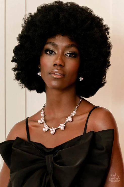 Clusters of pink pearls and dazzling white rhinestones join below the collar, creating refined frames. Infused with a glistening silver chain, the sections of luminescent frames trickle along the neck in a timeless fashion. Features an adjustable clasp closure.