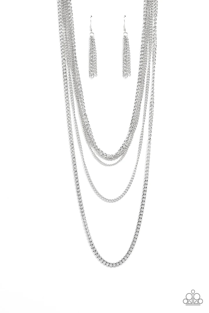 An intense display of mismatched silver chains boldly layer across the chest, resulting in an edgy industrial vibe. Features an adjustable clasp closure.