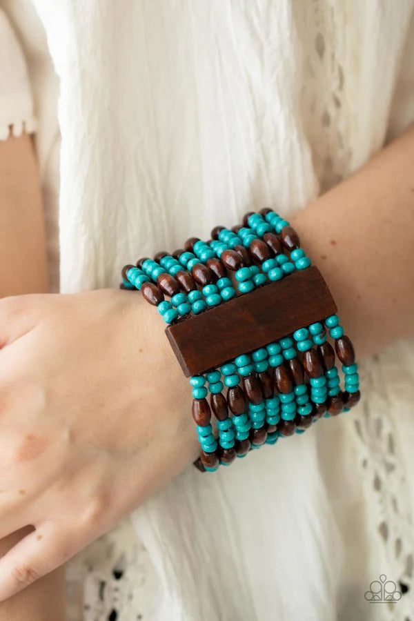 Stacked layers of bright turquoise and brown wooden beads are threaded along stretchy bands and wrap around the wrist in a linear pattern. Three wide wooden bars interrupt the pattern, adding weight to the tropically inspired collection.