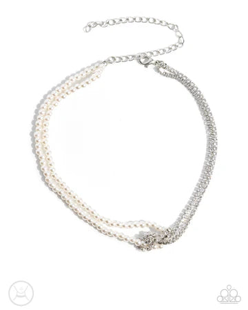 A duo of white rhinestones in silver square fittings collides with layers of white pearls to create a refined blend of color and glitz along the collar. The sleek rhinestones are tied around the bubbly pearls linking through additional white rhinestone-dusted square fittings, perfectly balancing the contrasting design. Features an adjustable clasp closure.