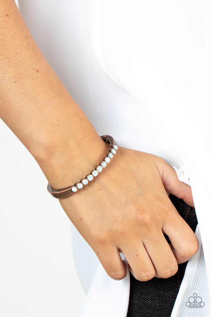 An opalescent row of white rhinestones hinges to an antiqued copper bar that curves around the wrist, creating a sparkly cuff-like bracelet. Features a hinged closure.