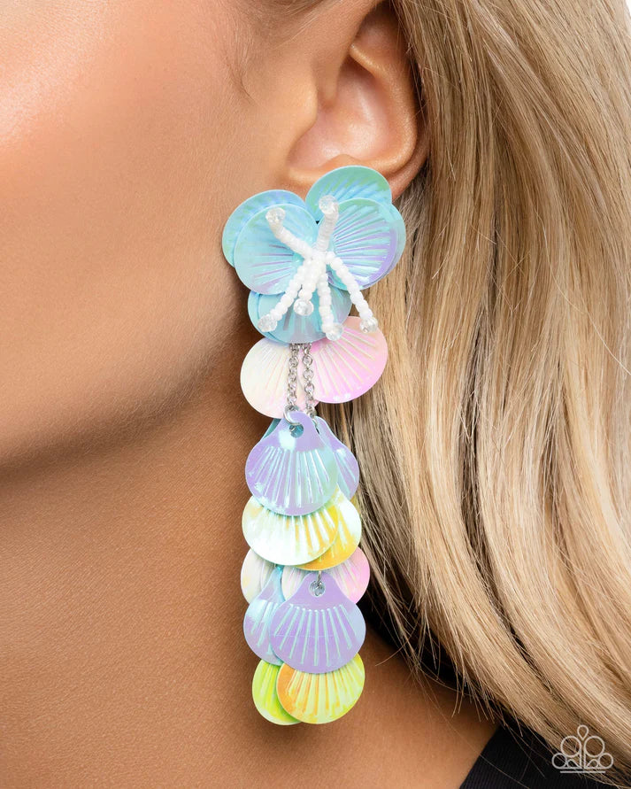 Featuring an iridescent hue, a collection of light turquoise, light green, and white sequins cascade from a collection of light turquoise sequins that flourish from a white seed beaded starfish for a coastal, chic look. Earring attaches to a standard post fitting. Due to its prismatic palette, color may vary.