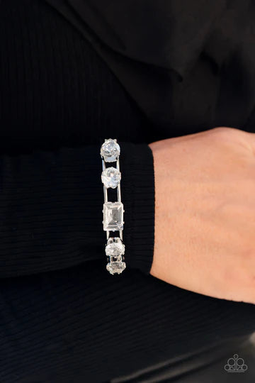 Set in elevated, silver-pronged settings, an oversized collection of white gems adorns the top of an airy silver cuff. Featuring various shapes, the oversized collection showcases endless light-catching texture across its faceted surface, creating blinding bling atop the wrist.