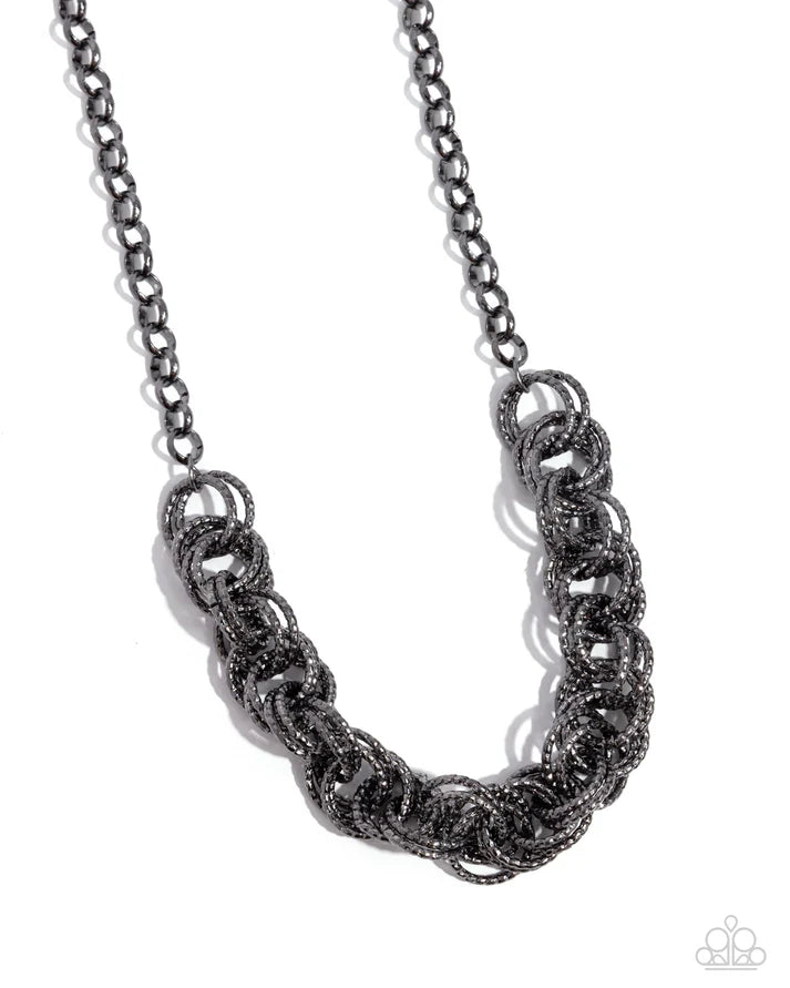 Pairs of textured gunmetal hoops boldly interlock at the bottom of a chunky gunmetal chain, resulting in a noisy statement piece below the collar. Features an adjustable clasp closure.