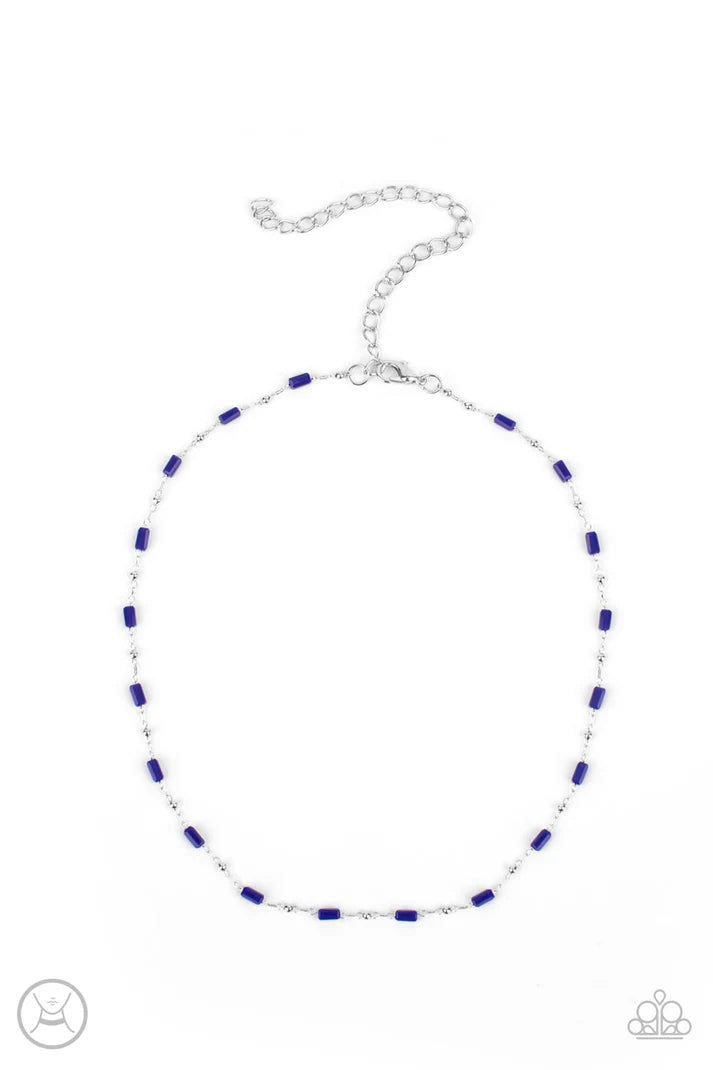 Dainty silver beads and cylindrical blue beads delicately link around the neck, creating a minimalist inspired pop of color. Features an adjustable clasp closure.