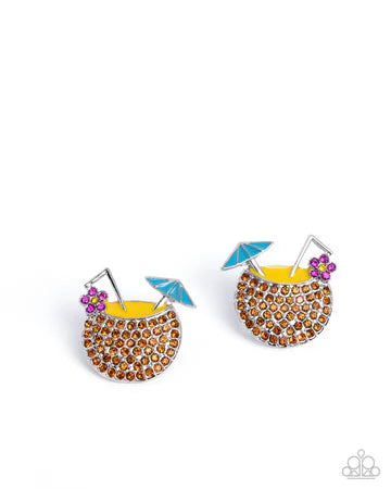 Featuring a yellow-painted interior, a topaz rhinestone-embellished coconut cup complete with a silver straw, a turquoise-painted umbrella, and a fuchsia rhinestone flower with a yellow rhinestone center coalesces atop the ear for a tropical twinkling display. Earring attaches to a standard post fitting.