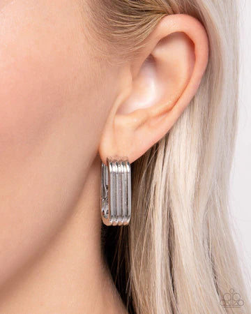 Textured silver links curl into a glistening oval that hugs along the ear for an opulent original display. Earring attaches to a standard hinge closure fitting. Hoop measures approximately 3/4" in diameter.