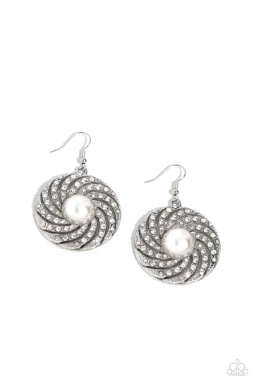 Dotted in dainty silver studs, ribbons of white rhinestones whirl around an oversized pearl center for a hypnotic twinkle. Earring attaches to a standard fishhook fitting.