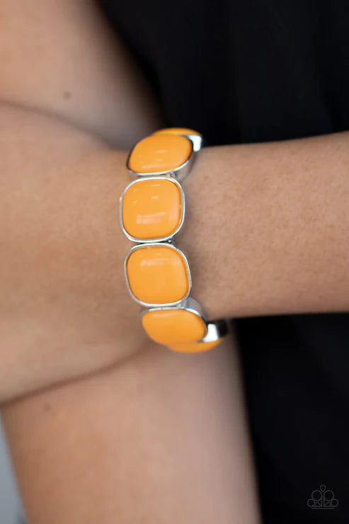 Zesty Saffron beads are pressed into sleek silver fittings that slide along stretchy bands around the wrist, creating a vivacious pop of color.
