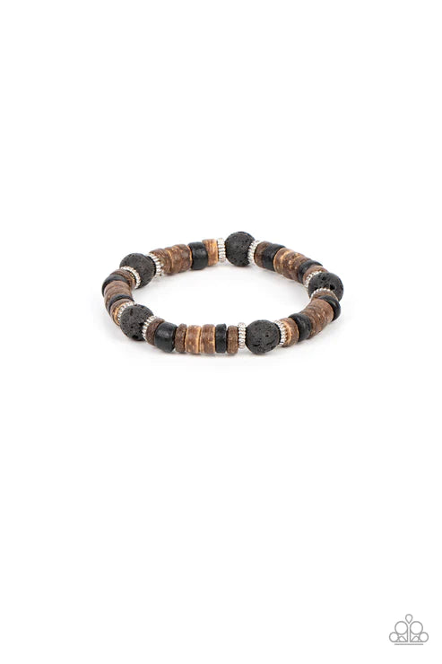 A mismatched assortment of silver rings, black lava rock beads, and distressed brown and black wooden beads are threaded along stretchy bands around the wrist for an earthy flair.