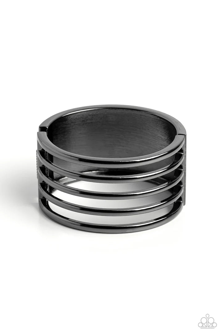 Stemming from a thick gunmetal cuff, glistening bars of gunmetal arc across the top of the wrist for a warrior-worthy finish. Features a hinged closure.