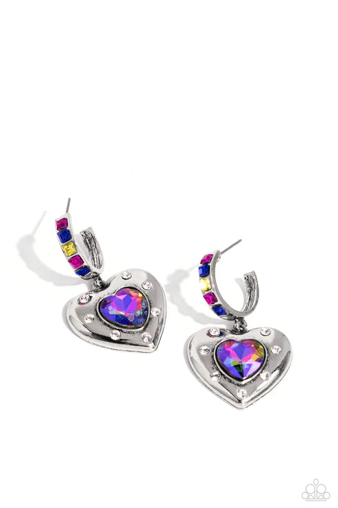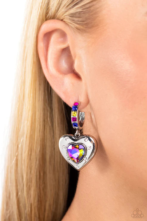 Featuring a UV shimmer, a pink/blue heart gem is pressed into an antiqued silver heart frame adorned in white rhinestones. The antiqued heart sways from the bottom of a thick silver hoop encrusted in square pink, blue, and yellow gems resulting in a whimsical fashion. Earring attaches to a standard post fitting. Hoop measures approximately 3/4" in diameter. Due to its prismatic palette, color may vary.