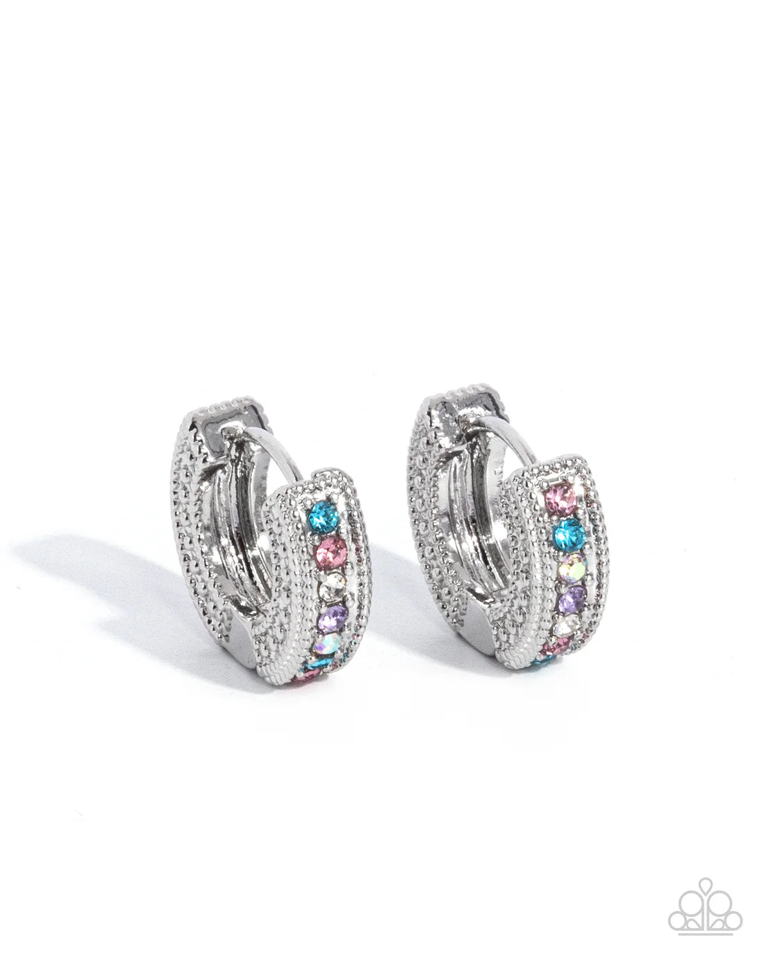 Pronged along the center of a silver studded hoop, a collection of dainty, round multicolored and iridescent rhinestones glitters and hugs the ear for a shimmering statement. Earring attaches to a standard hinge closure fitting. Hoop measures approximately 3/4" in diameter. Due to its prismatic palette, color may vary.