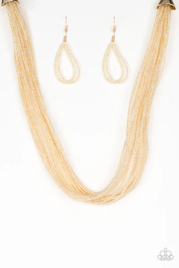 Infused with two large gold fittings, golden seed beads are threaded along countless strands, creating dramatic layers below the collar for a seasonal look. Features an adjustable clasp closure. Sold as one individual necklace. Includes one pair of matching earrings.