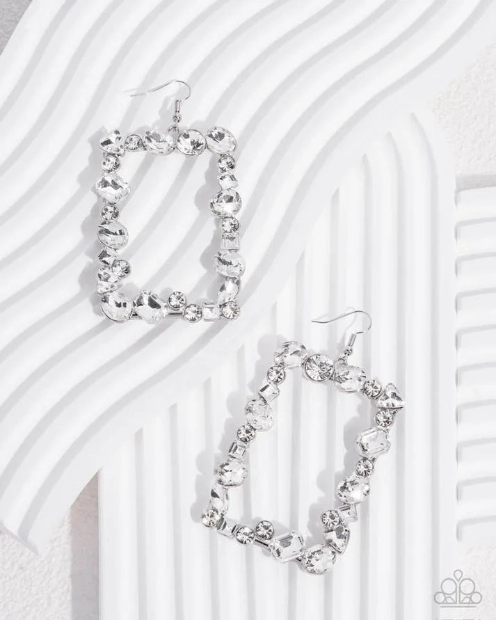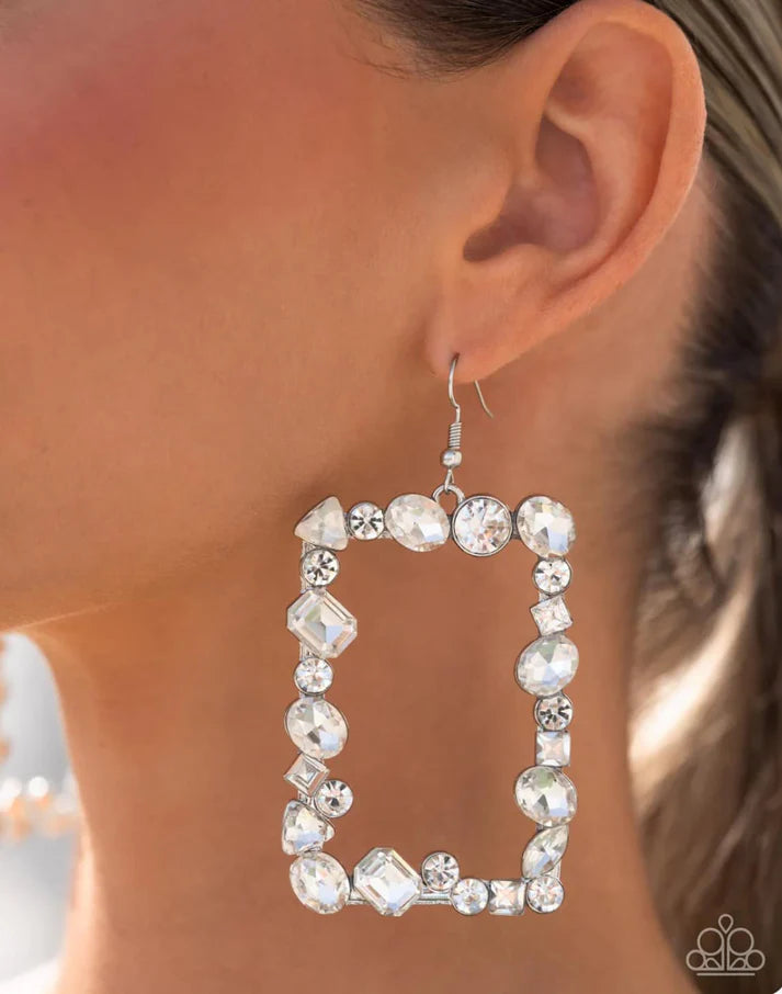 Featuring a collection of highly faceted and reflective white gems in round, oval, square, marquise-cut, triangular, and emerald-cuts, an oversized silver rectangular frame swings from the ear for a refined lure. Earring attaches to a standard fishhook fitting.