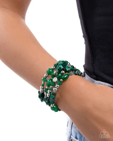 A collection of green acrylic beads and shells in various shapes and sizes, interspersed with silver accents, coil around the wrist, creating a vibrant display of color. The coiled design ensures a comfortable fit while adding a playful splash of color to any ensemble.