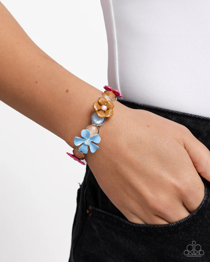 Threaded along elastic stretchy bands, a collection of faceted gems in multicolored shades are pressed into sleek silver frames. Buckthorn Brown, Winter Sky, and Desert Rose flowers with multicolored opalescent rhinestone centers sporadically bloom atop the faceted display creating a glamorously whimsical look around the wrist.