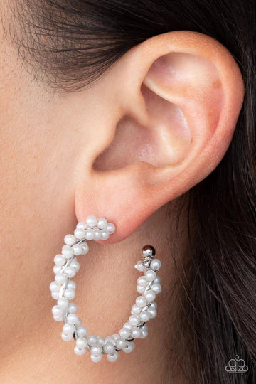 A dainty strand of white pearls is delicately wrapped around a classic silver hoop, creating bubbly refinement. Earring attaches to a standard post fitting. Hoop measures approximately 1 1/2" in diameter.