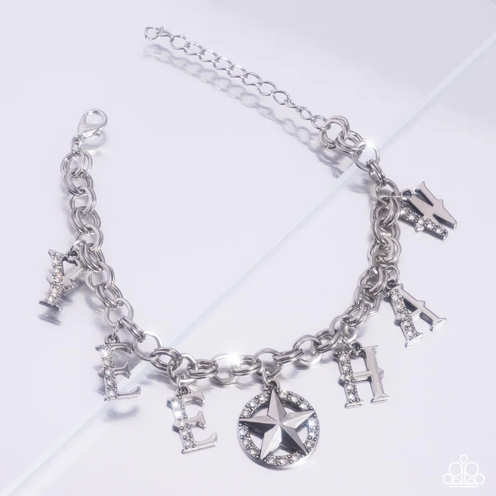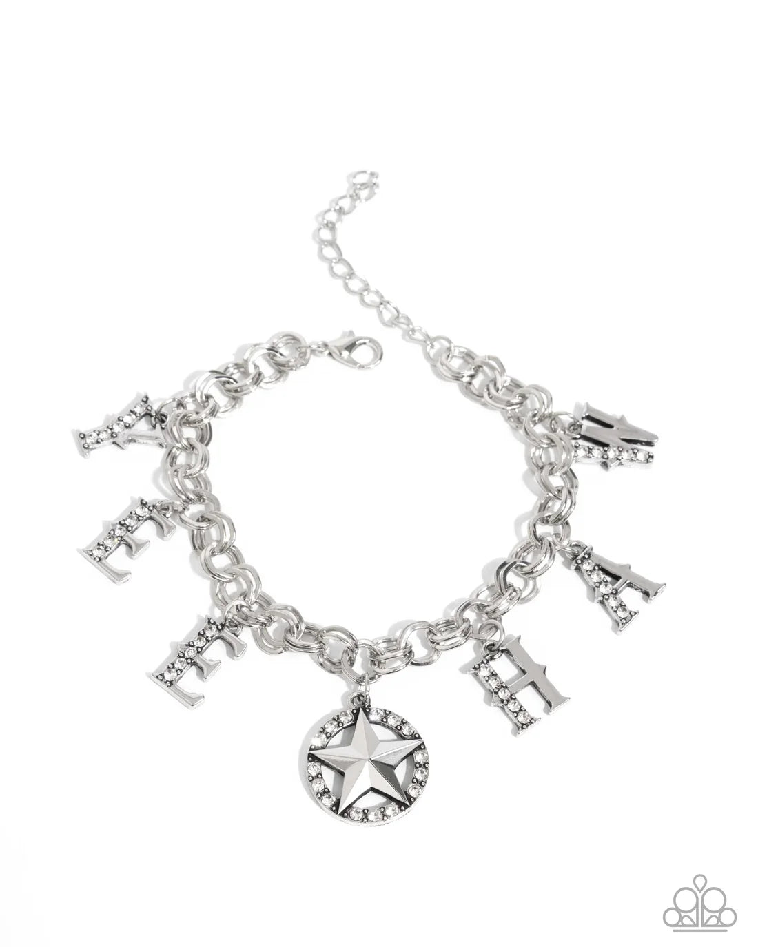 Swinging along doubled rings of silver, a collection of silver serif words lined with a row of white rhinestones spells out the phrase “Yee Haw” for a radiant, rambunctious display. A raised antiqued silver star charm sits atop a circle of rhinestones, separating the words “Yee Haw” for additional Western-inspired whimsy and shimmer. Features an adjustable clasp closure.