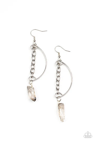 Featuring a smoky finish, a glassy crystal-like bead swings from the bottom of a solitaire silver chain that attaches to a bowing silver bar for an edgy look. Earring attaches to a standard fishhook fitting. As the stone elements in this piece are natural, some color variation is normal.