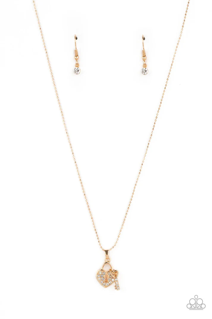 A small, heart-shaped pendant is filled with tiny white rhinestones that wrap around a keyhole cutout at its center. A small gold key, dotted with dainty white rhinestones and featuring a heart-shaped silhouette at the top, slides along the skinny gold ball chain next to the lock, completing the set. Features an adjustable clasp closure.