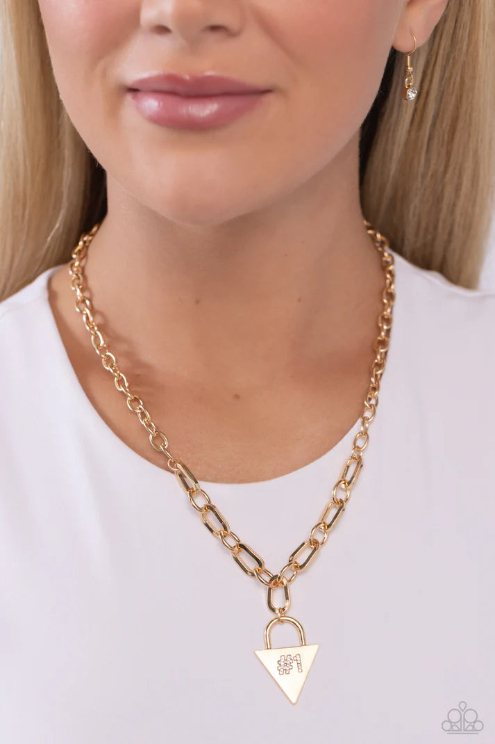 Dangling from a collection of oversized, curved links connected to a gold link chain, a locket-inspired pendant rests in the shape of a triangle. Embossed in white rhinestones, a #1 gleams from the center of the gold pendant for a sports-inspired finish. Features an adjustable clasp closure.