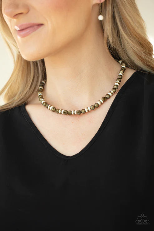A rustic collection of brass discs, ornate brass beads, and earthy white stones are threaded along an invisible wire below the collar for a seasonal look. Features an adjustable clasp closure.